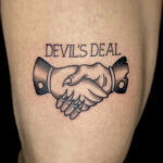 Tetování ruce a nápis na stehně