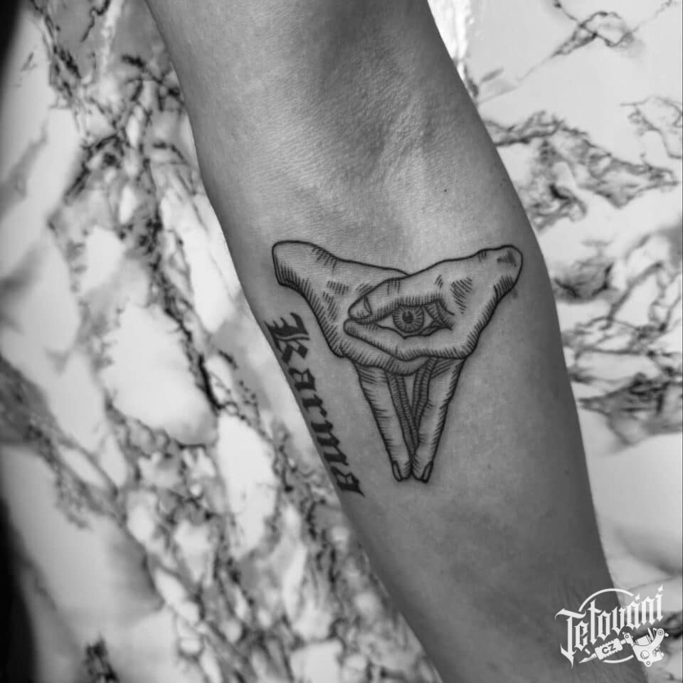 Tetování ruce, oko, boží oko a nápisy na předloktí