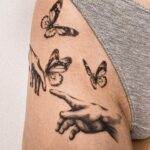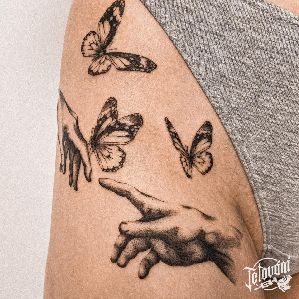 Tetování ruce, motýli na stehně
