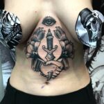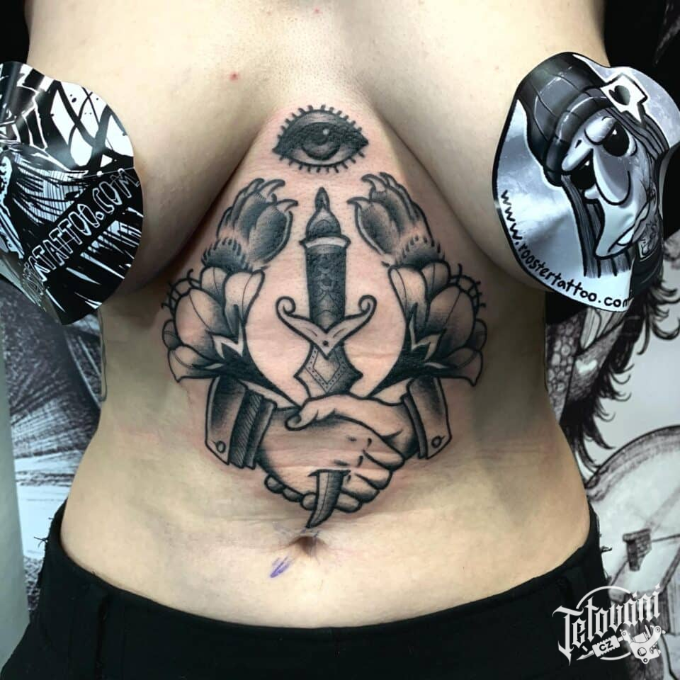 Tetování ruce, oko, květiny na břichu