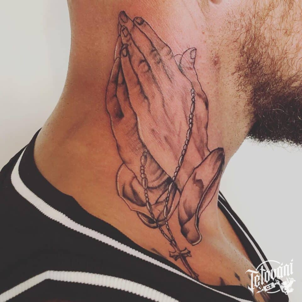 Tetování ruce s růžencem na krk