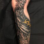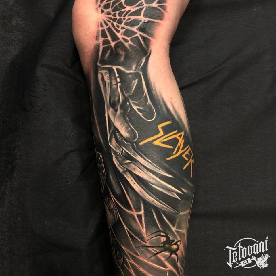 Tetování ruce, zvíře pavouk s pavučinou, jména na holeň