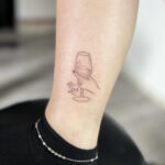 Tetování ruka držící skleničku vína a písmena, monogramy na noze