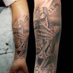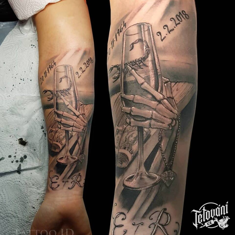 Tetování ruka držící skleničku vína, řetízek, nápisy, datum, písmena, štír na předloktí