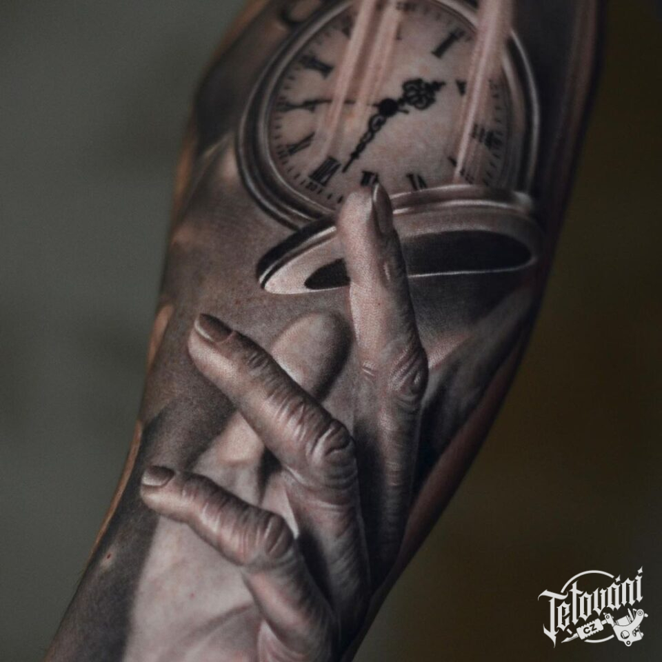 Tetování ruka, kapesní hodiny na předloktí