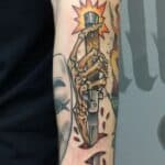 Tetování ruka kostlivce a znaky a symboly, nůž na předloktí