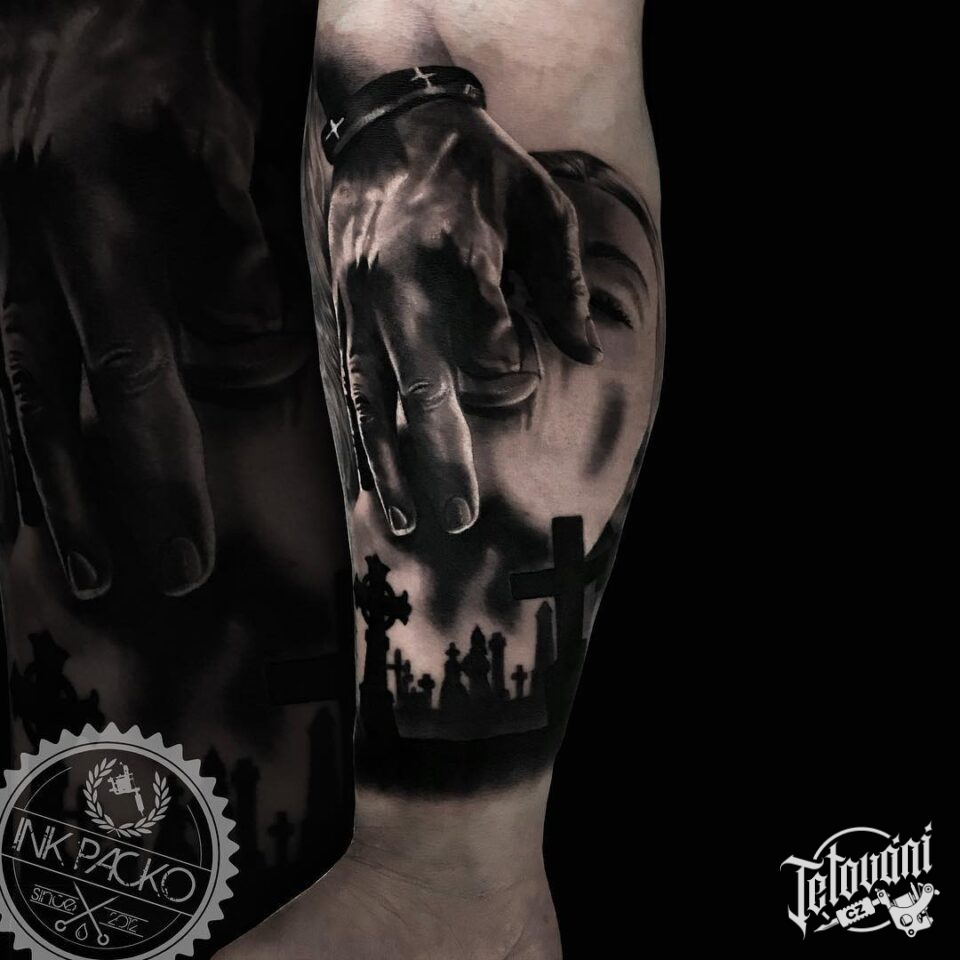 Tetování ruka s prstem v puse na předloktí
