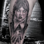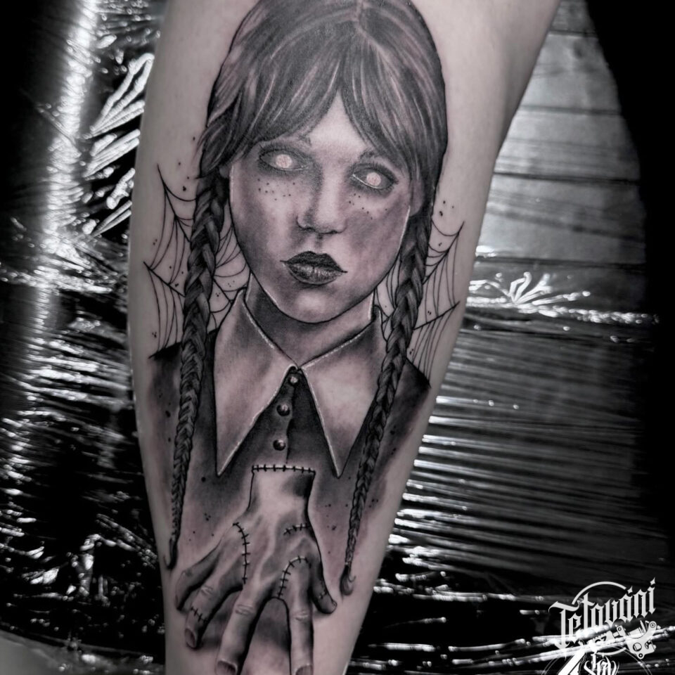 Tetování ruka Věc a portrét Wednesday z filmů a pohádek na lýtku