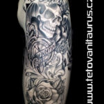 Tetování rukáv na paži – lebka, karty, hodiny a růže