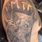 Tetování runa, zvířata, hlava vlka a havran na rameni