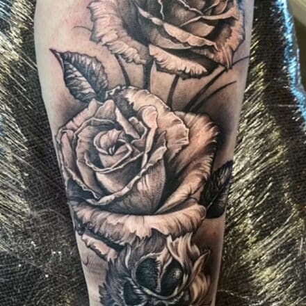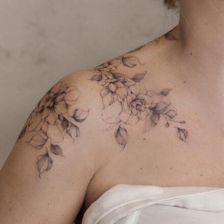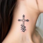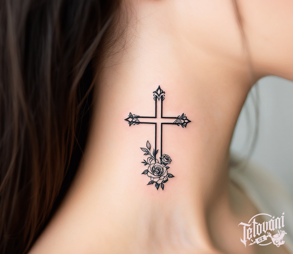 Tetování růže a křížek na krku