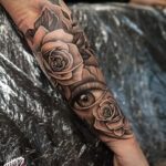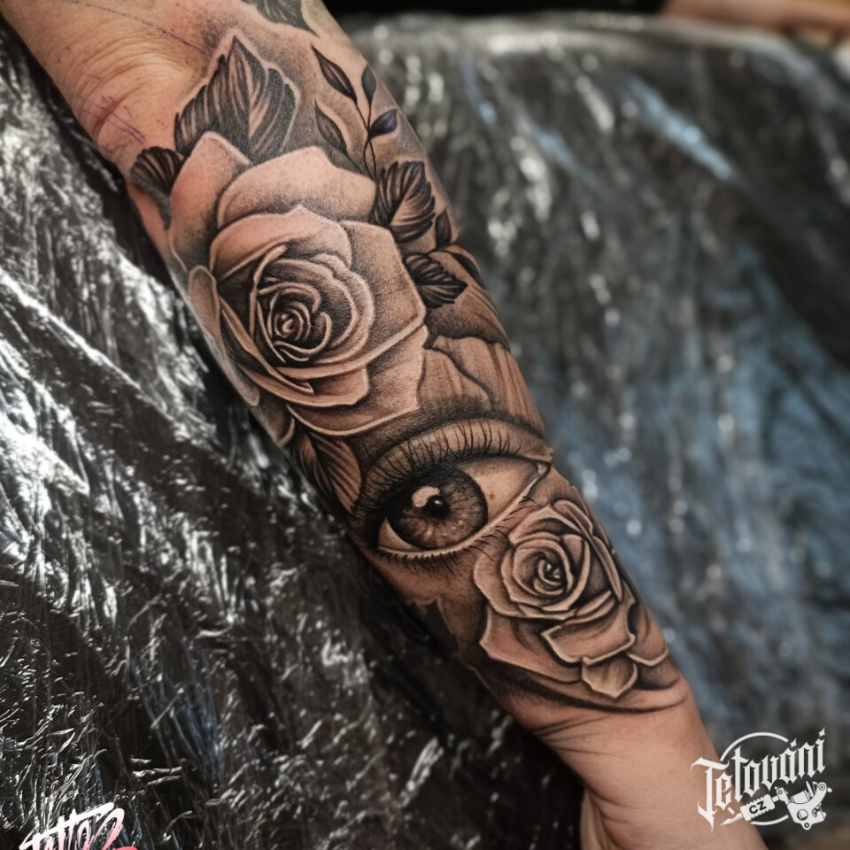 Tetování růže a oko na předloktí