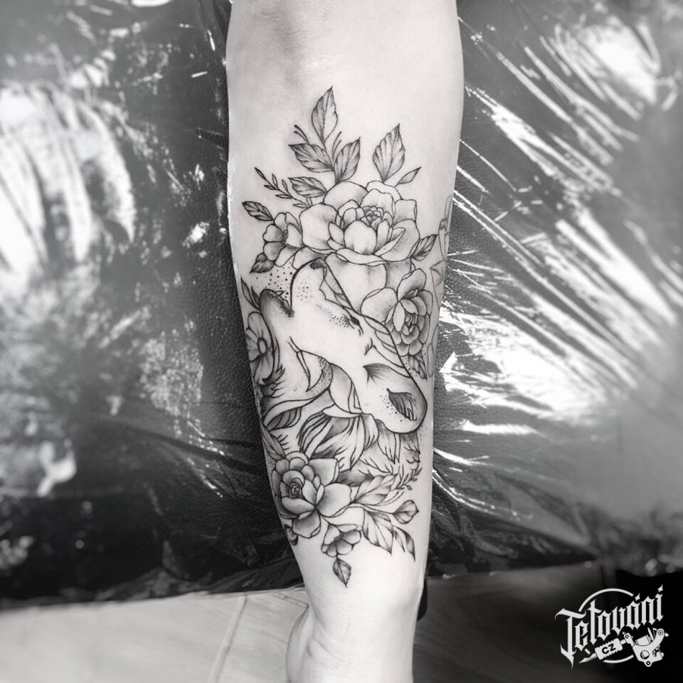Tetování růže a pes, zvíře, květiny na předloktí