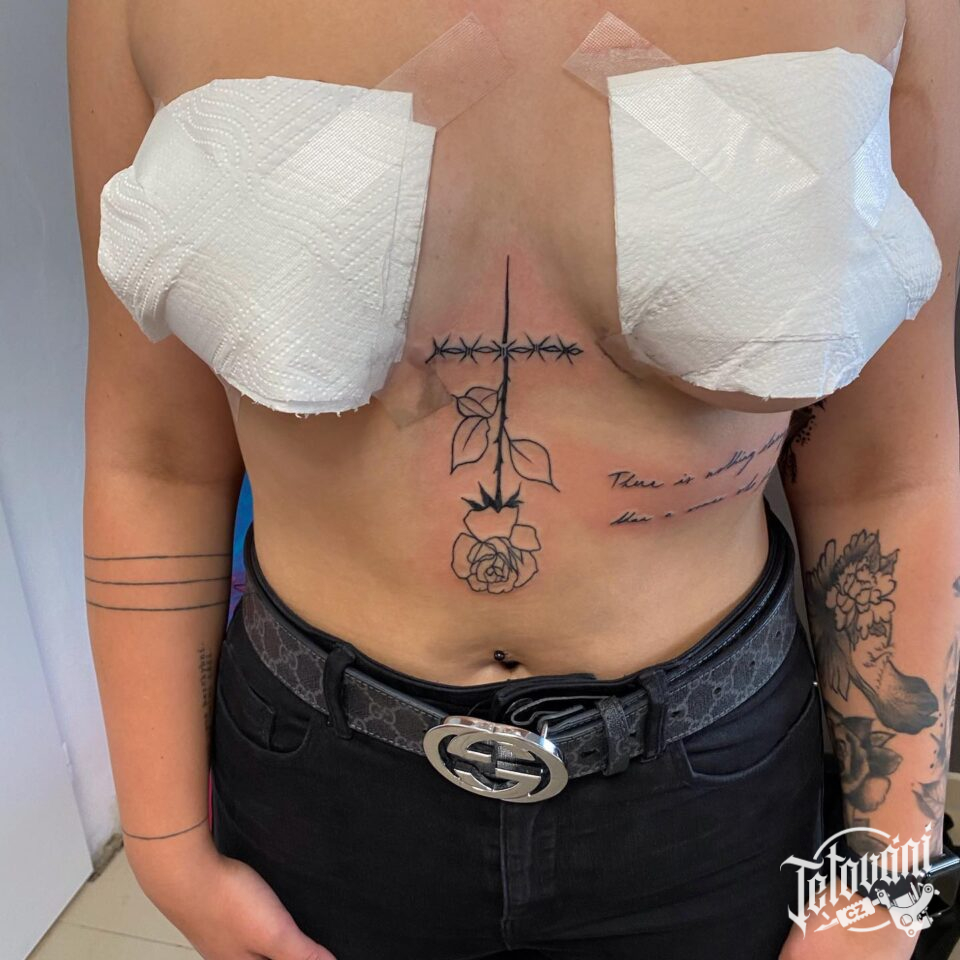 Tetování růže, kříž a ostnatý drát mezi prsa