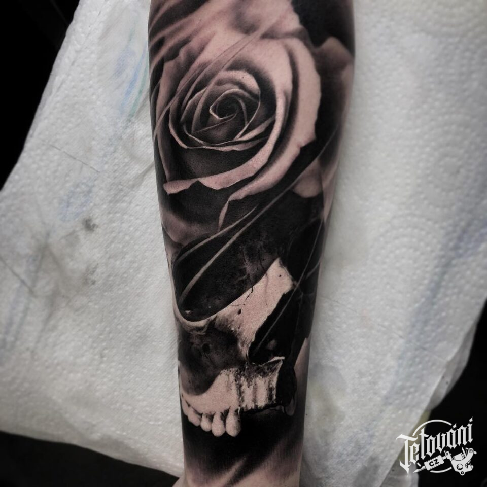 Tetování růže, lebka na předloktí