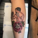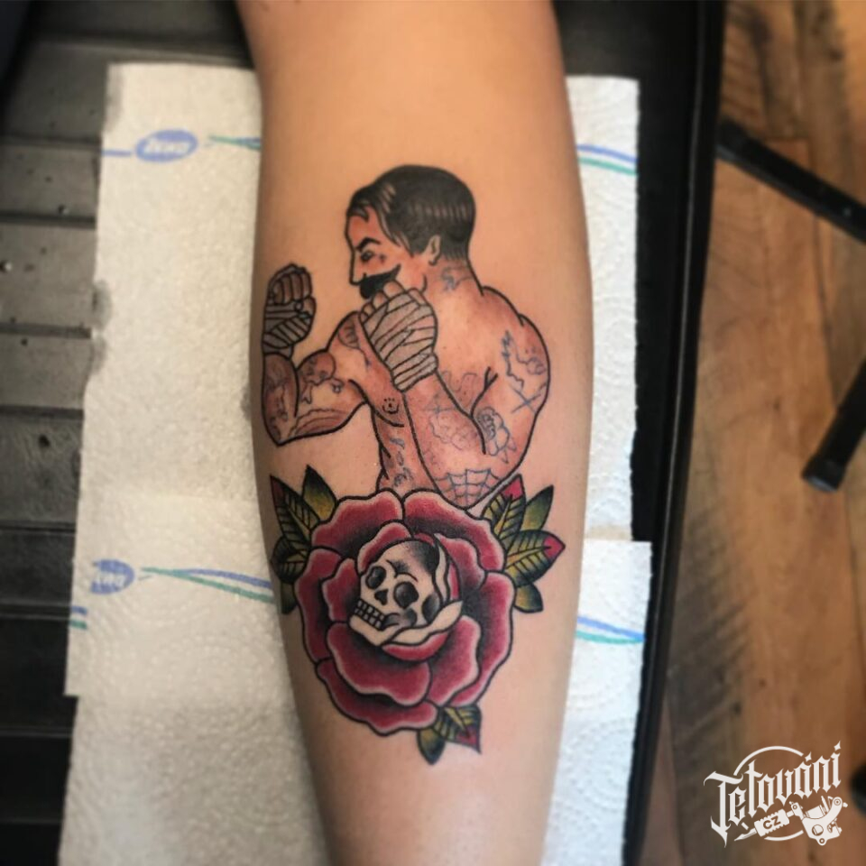 Tetování růže s květinou a boxér na lýtku