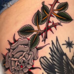 Tetování růže s větvičkou na stehně