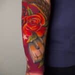 Tetování růže, symbol hudba, klavír a kočka na předloktí