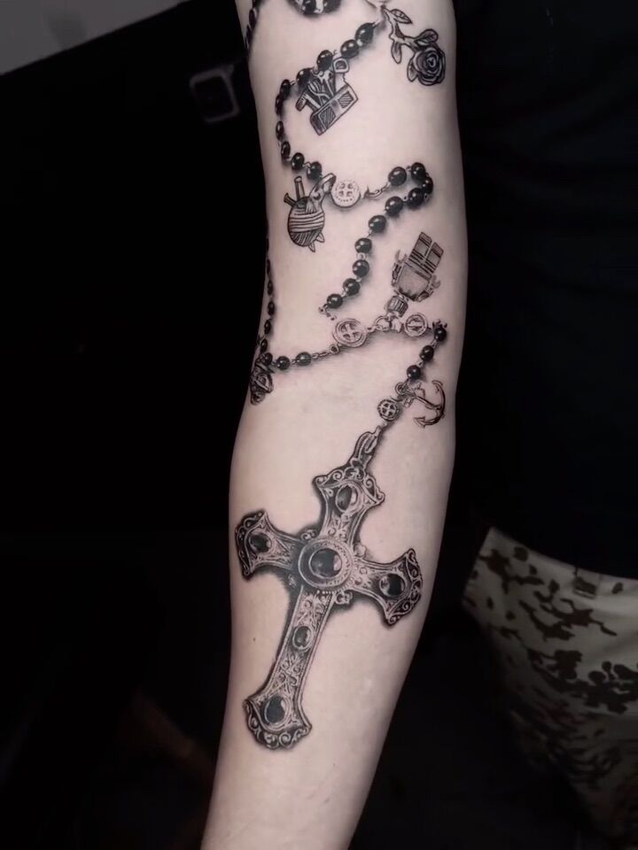 Tetování růženec, kříž na hřbet ruky