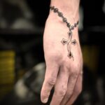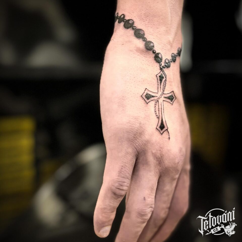 Tetování růženec s křížem na předloktí a hřbet ruky