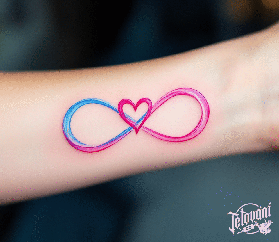 Tetování růžovo modrá ležatá osmička, nekonečno srdce na předloktí