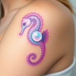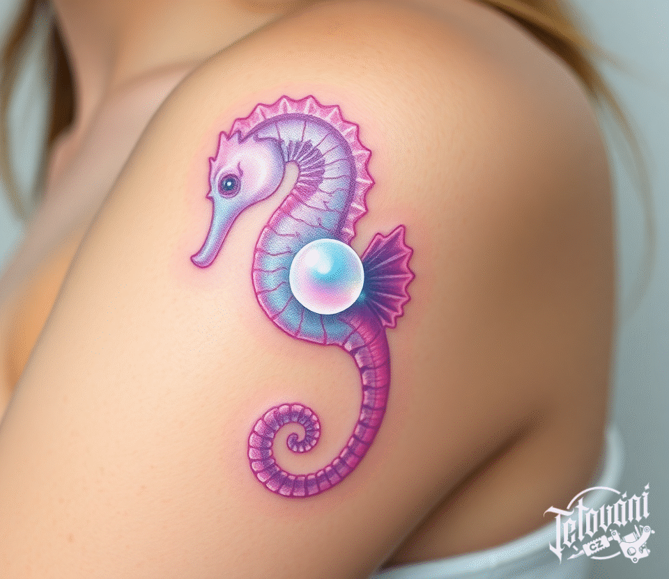 Tetování růžový mořský koník na rameno