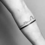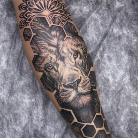 Tetování ryba a lev znamení zvěrokruhu, čáry kolem ruky na předloktí