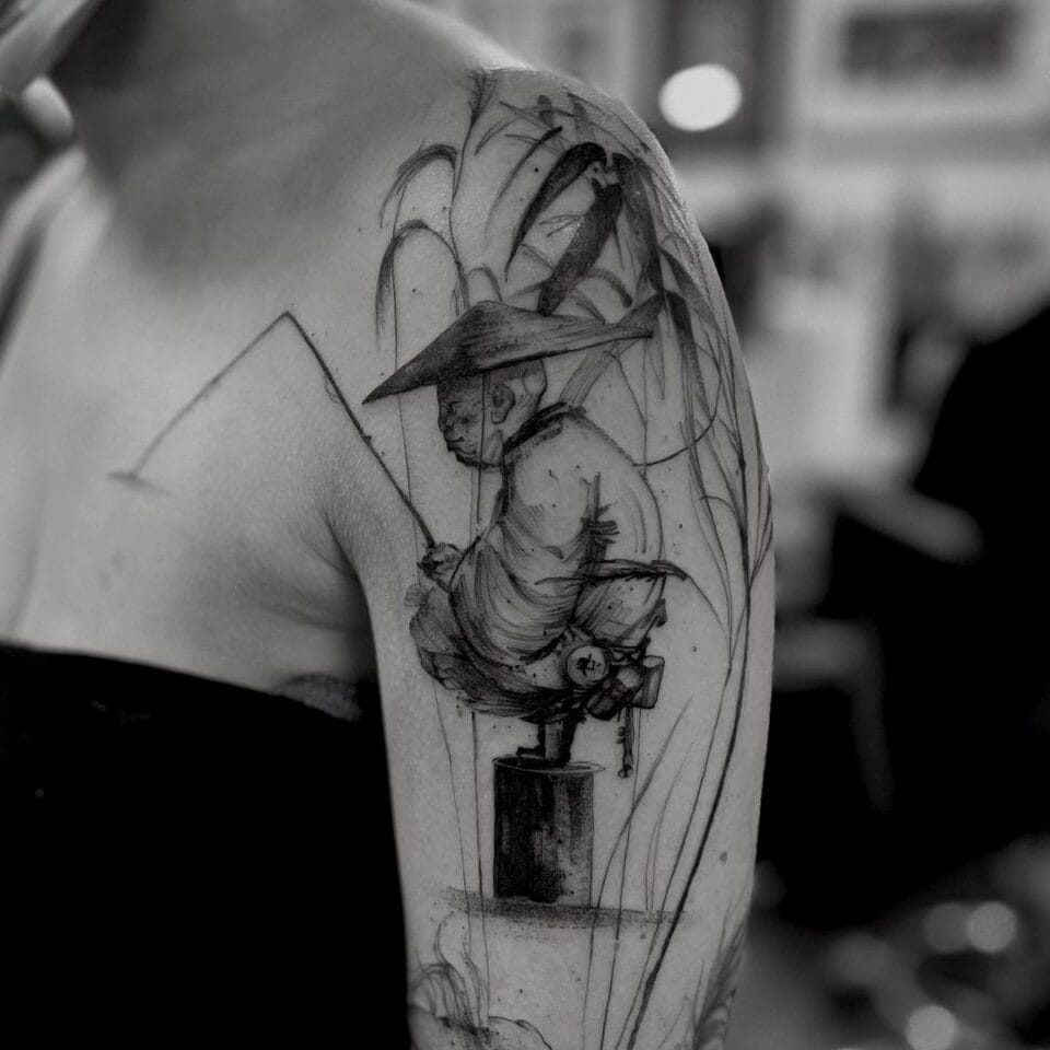 Tetování rybář samuraj postavička na rameno