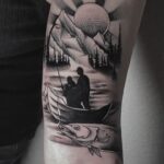 Tetování rybáři, ryba, slunce a hory na bicepsu