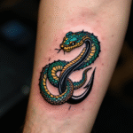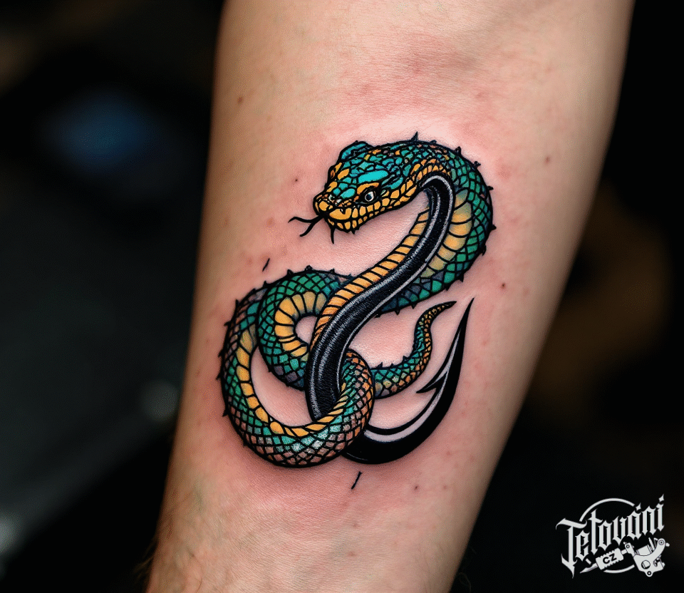 Tetování rybářský háček s hadem na předloktí