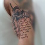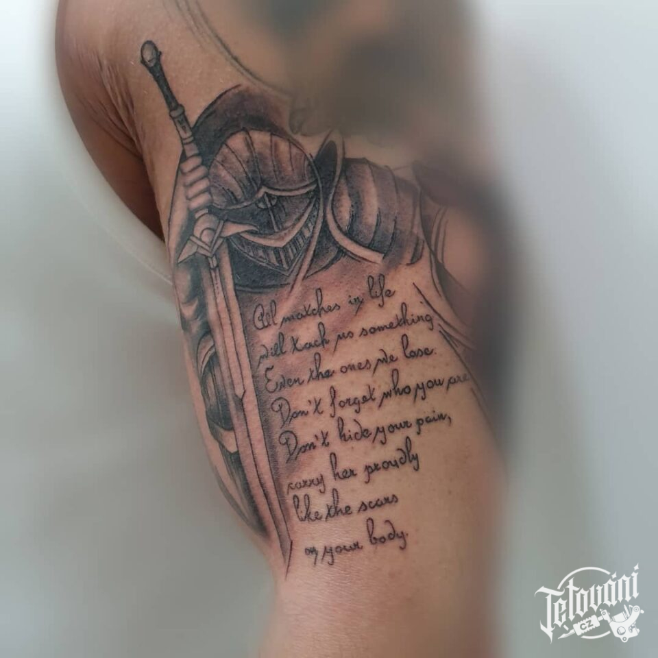 Tetování rytíř, meč a nápisy, citát na rameni