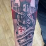Tetování rytíř, templářský kříž a nápisy na předloktí