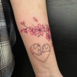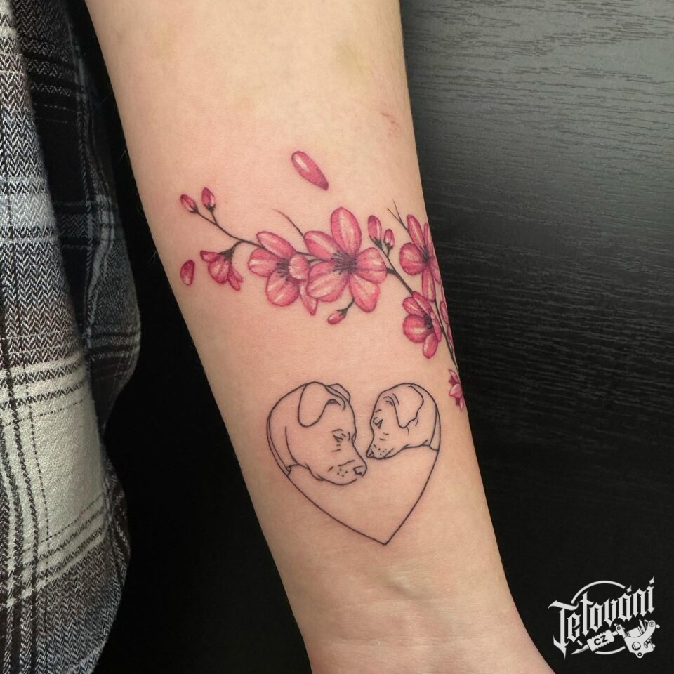 Tetování Sakura, symbol lásky, zvířata psi ve tvaru srdce na předloktí