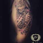 Tetování samuraj a květiny sakury na rameno