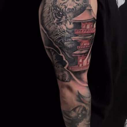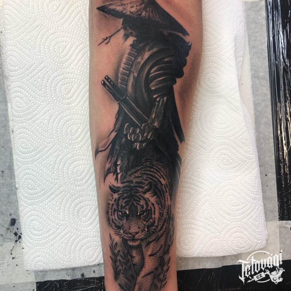 Tetování samuraj a tygr na předloktí