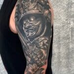 Tetování samuraj, bojovník, meč a sakura na rameni