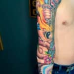 Tetování samuraj s mečem, květiny, znaky a symboly Jin a Jang, cestování, rukáv