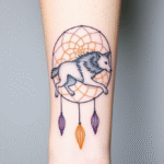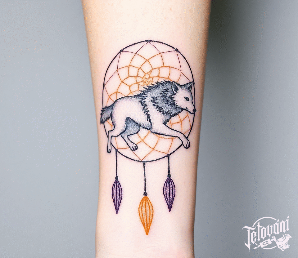 Tetování šedý vlk a barevný lapač snů na předloktí