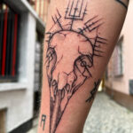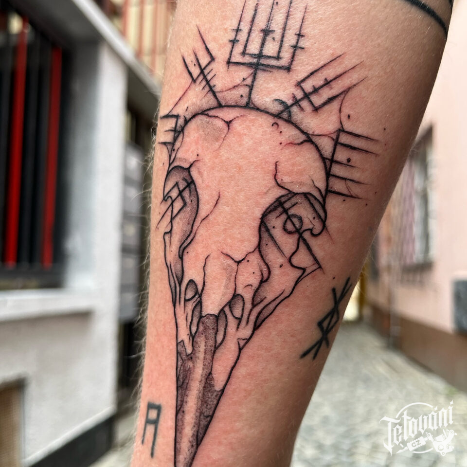 Tetování severská lebka havrana a runy na předloktí