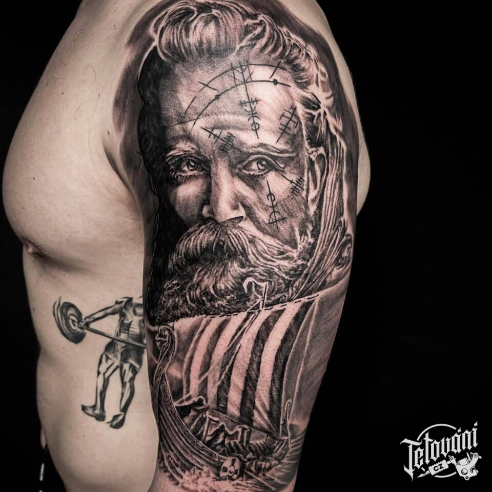 Tetování severská mytologie – portrét vikinga, loď, runa ochranné symboly na rameno