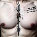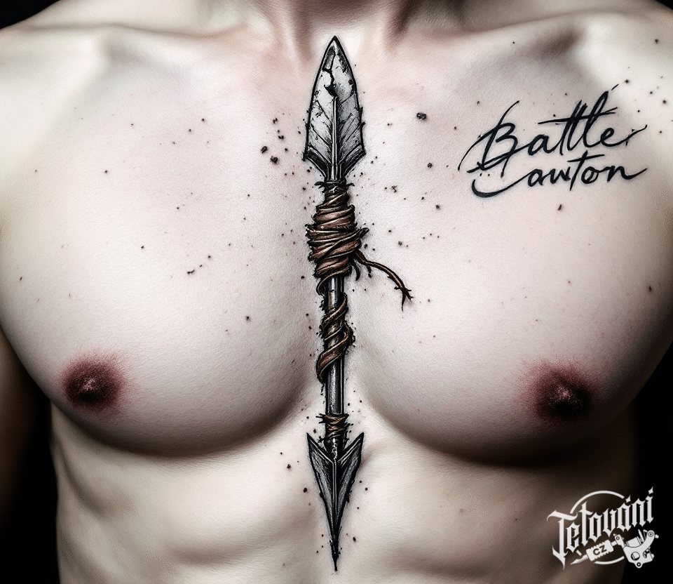 Tetování šíp, šipka a nápisy na hrudník