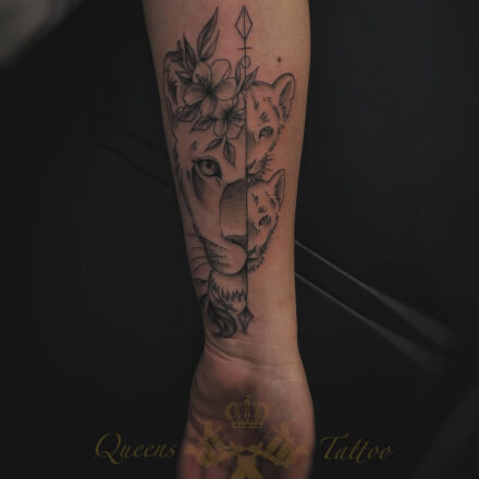 Tetování šíp, zvíře, lev znamení zvěrokruhu na předloktí