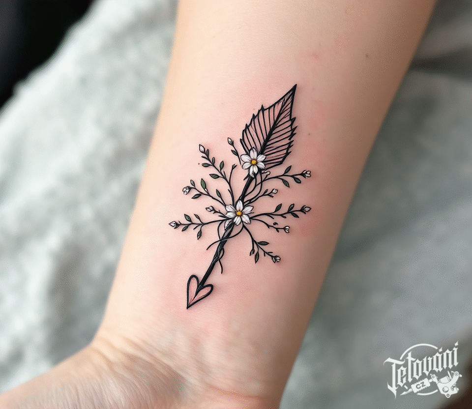Tetování šipka s květinami na předloktí