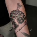 Tetování šipky a terč, nápisy, čísla na předloktí