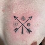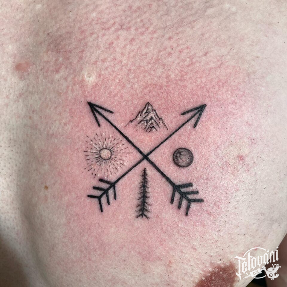 Tetování šípy a slunce, měsíc, hory a strom na prsu