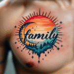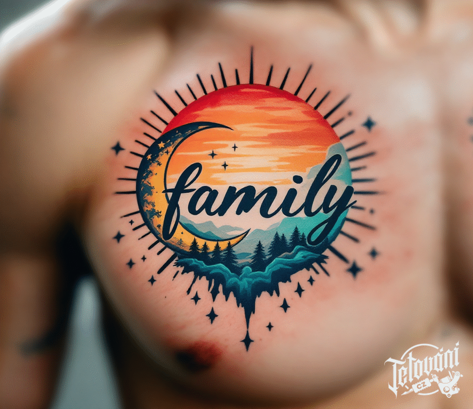 Tetování slunce a měsíc s nápisem family na prso