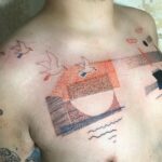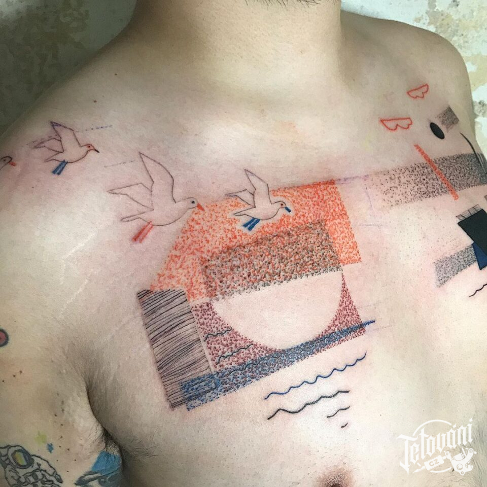 Tetování Slunce a ptáci na hrudi