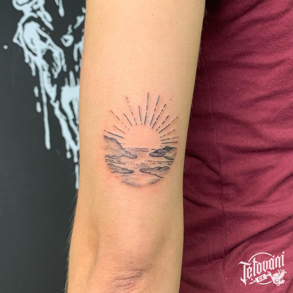 Tetování slunce a znaky a symboly, mraky na paži