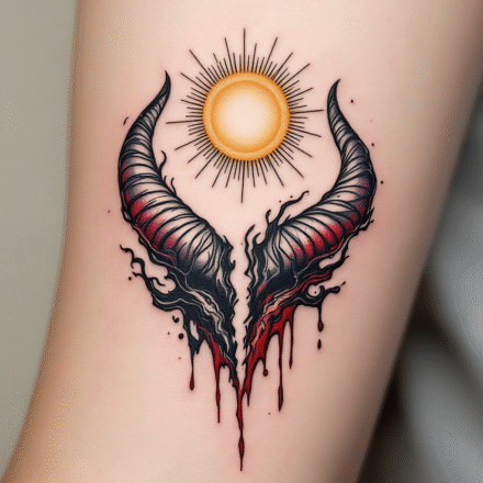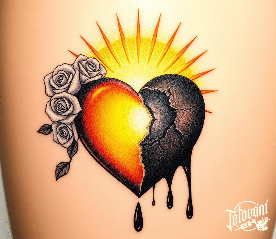 Tetování Slunce, srdce dobro a zlo na boku stehna