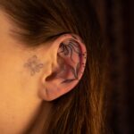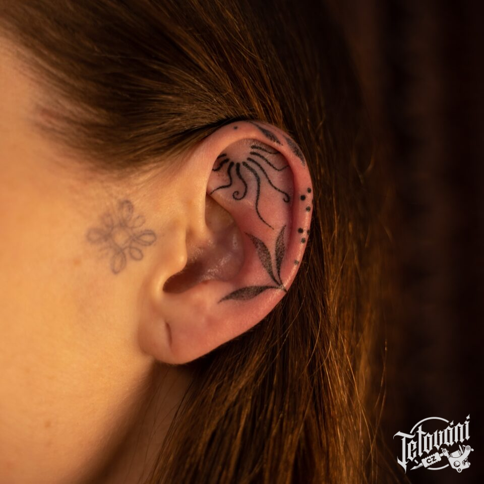 Tetování slunce, větvička a tečky, symboly na ucho